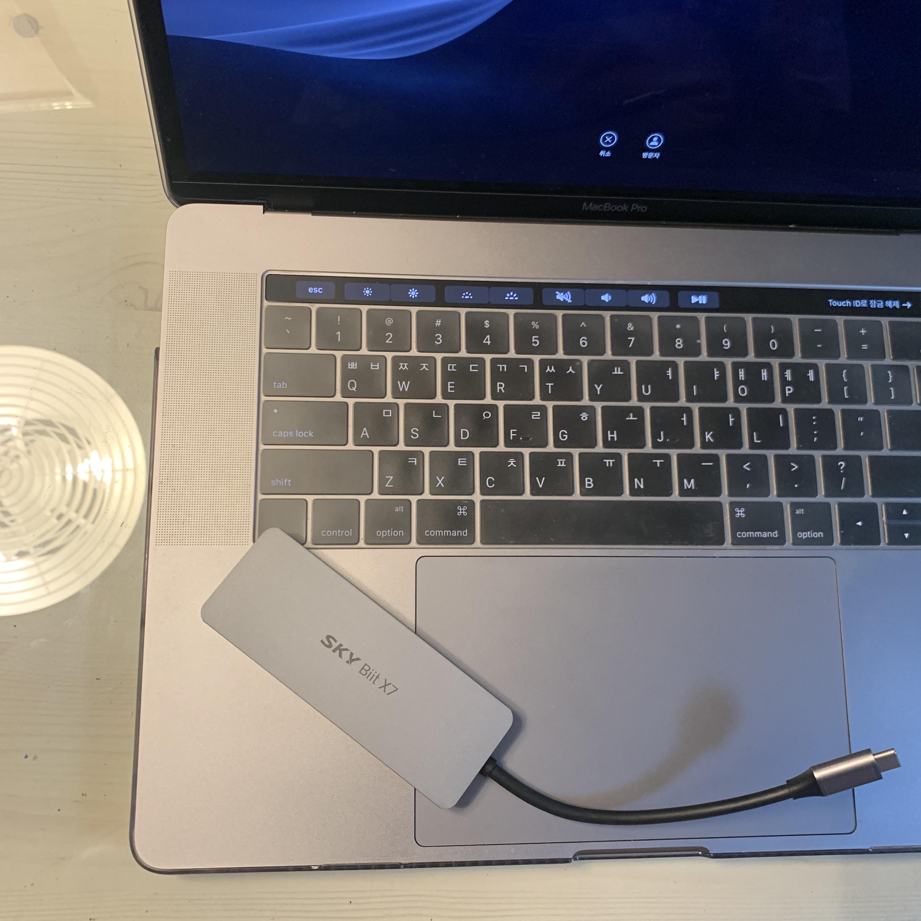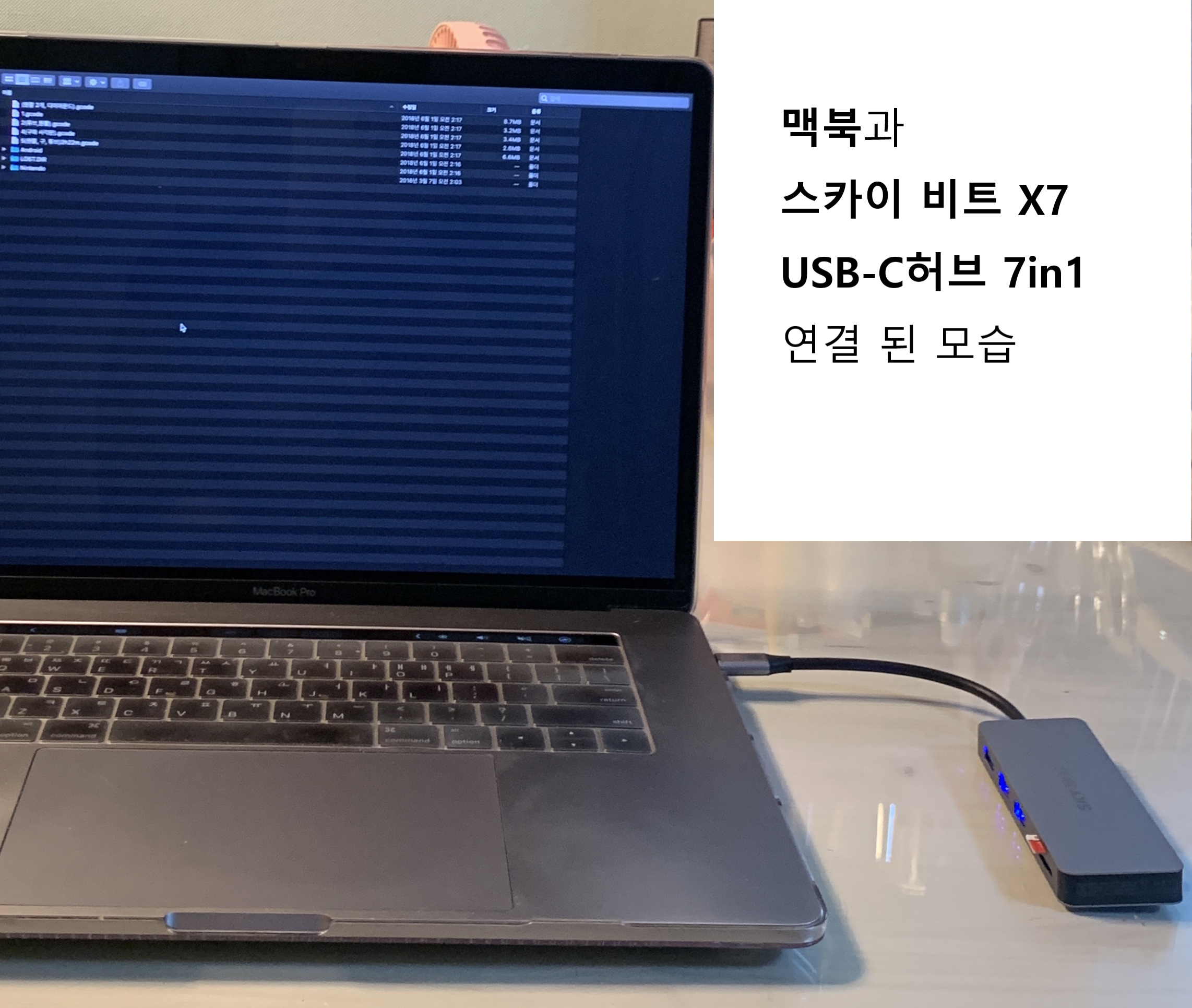 하단 이미지는 맥북과 스카이 비트 X7 USB-C허브 7in1이 연결된 모습입니다.