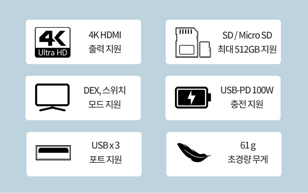 연결방식 : 무전원(USB)단자 : USB포트, HDMI포트, SD카드, LAN포트, MicroSD카드, 이더넷, USB-PDPC연결 방식 : USB3.0단자타입 : Type C형태 : 일체형케이블, I자케이블, 케이블일체형, 슬림형품목 : 영상, 음성,