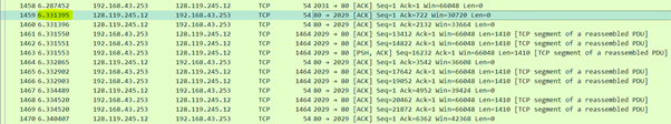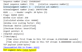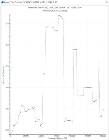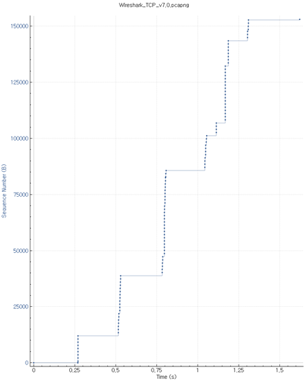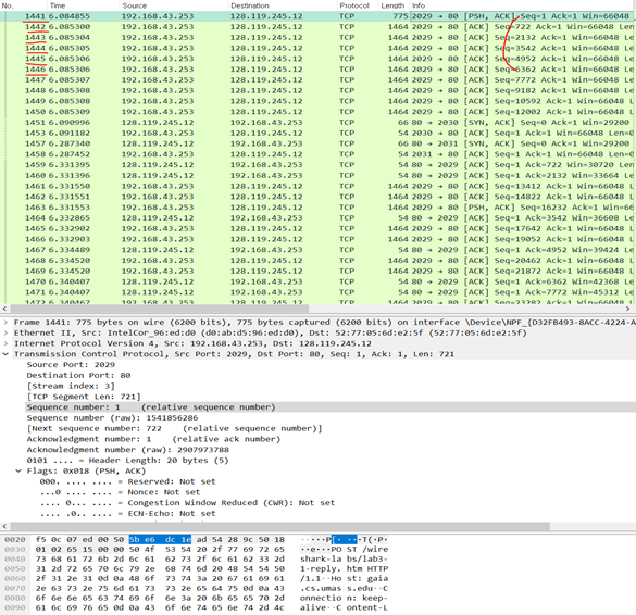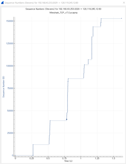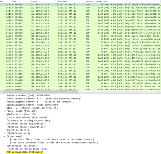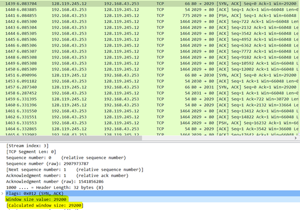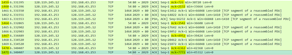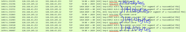 >> 2개의 연속된 ACK에서 acknowledged sequence number간의 차이는 서버가 두 ACK간에 수신한 데이터를 나타낸다. ACK 숫자가 722, 2132, 3542, 4952, 6362, 7772의 순서로 증가하는 것을 볼 수 있다. ACK 번호는 매번 1410씩 증가하여, receiver가 1410 bytes를 acknowledging하고 있음을 나타낸다.