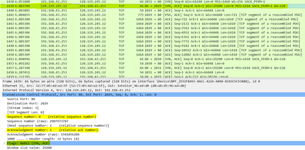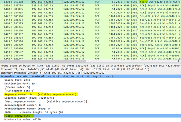 5. What is the sequence number of the SYNACK segment sent by gaia.cs.umass.edu to the client computer in reply to the SYN? What is the value of the Acknowledgement field in the SYNACK segment? How did gaia.cs.umass.edu determine that value? What is it in the segment that identifies the segment as a SYNACK segment?