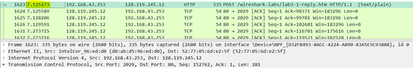 6. What is the sequence number of the TCP segment containing the HTTP POST command? Note that in order to find the POST command, you’ll need to dig into the packet content field at the bottom of the Wireshark window, looking for a segment with a “POST” within its DATA field.