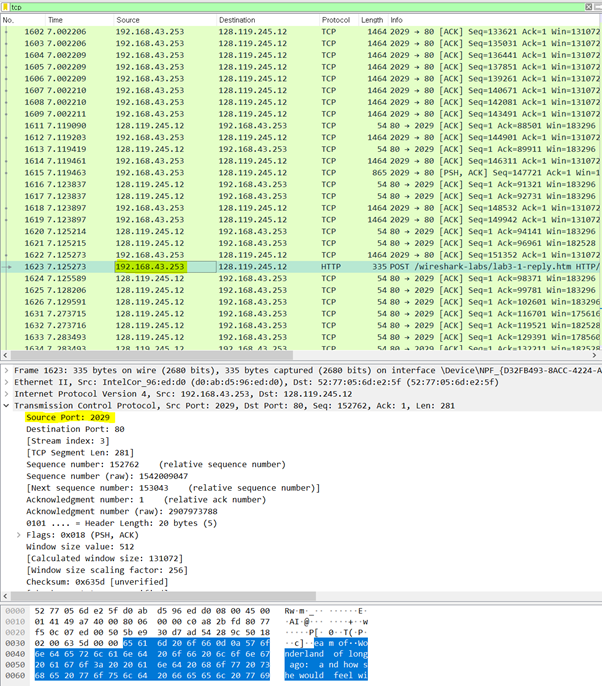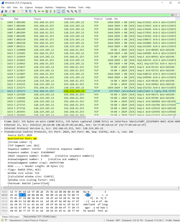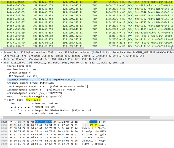 1. What is the IP address and TCP port number used by the client computer (source) that is transferring the file to gaia.cs.umass.edu? To answer this question, it’s probably easiest to select an HTTP message and explore the details of the TCP packet used to carry this HTTP message, using the “details of the selected packet header window” (refer to Figure 2 in the “Getting Started with Wireshark” Lab if you’re uncertain about the Wireshark windows.