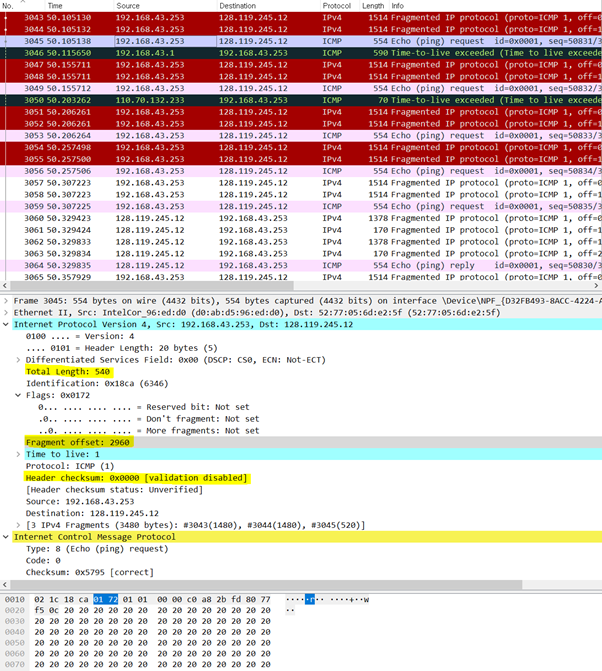 >> 변경되는 IP header fields는 Fragment offset, checksum이다. 또한 처음 두 패킷과 마지막 패킷 사이에 Total Length와 flags에서도 변화가 있다. 처음 2개의 패킷은 Total Length가 1500이고, 마지막 패킷은 Total Length가 540으로 더 짧다.