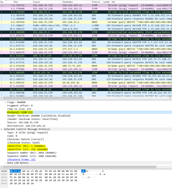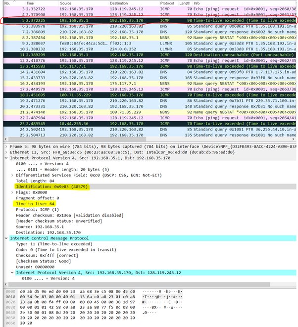 >> Identification field는 고유한 값이기 때문에 모든 ICMP TTL-exceeded 응답에서 Identification field가 변경된다. 만약 둘 이상의 IP datagrams에 동일한 identification 값이 있다면, 이러한 IP datagram이 하나의 큰 IP datagram의 fragments라는 뜻이다.