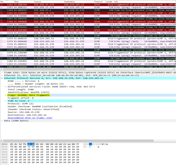 >> Flags가 더 많은 fragments에 대해 설정되어 있다는 건 datagram이 fragmented 되었음을 의미한다.