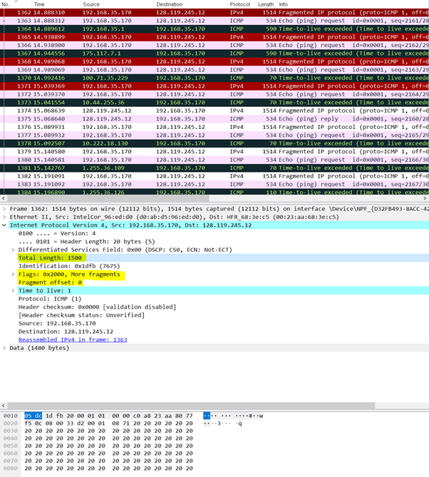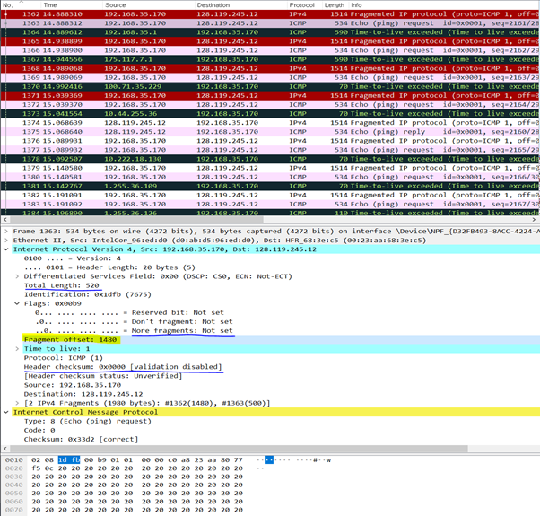 10. Find the first ICMP Echo Request message that was sent by your computer after you changed the Packet Size in PingPlotter to be 2000. Has that message been fragmented across more than one IP datagram?