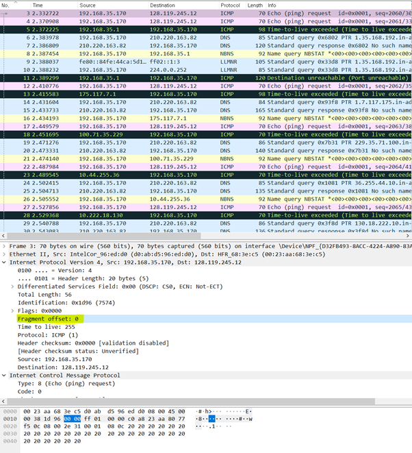 >> Fragment offset이 0이므로, IP datagram은 not been fragmented. (패킷이 조각화 되지 않았다.)
