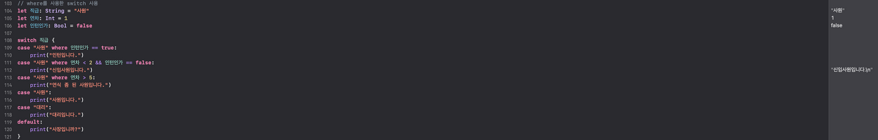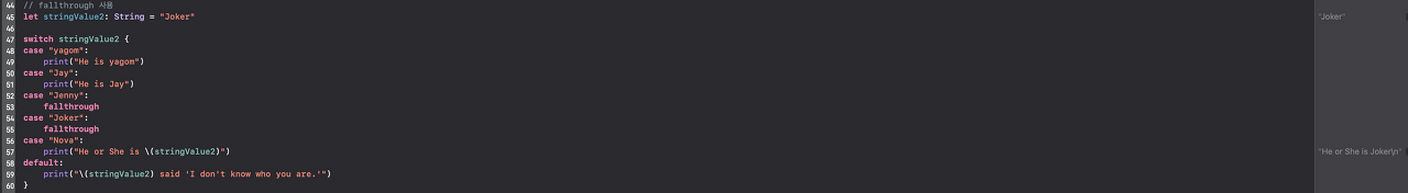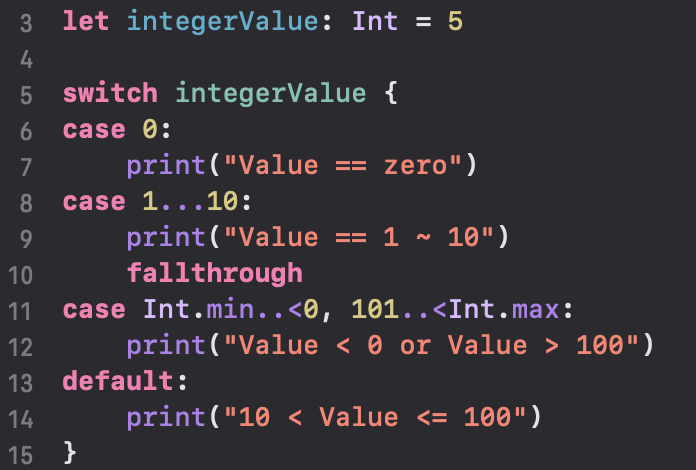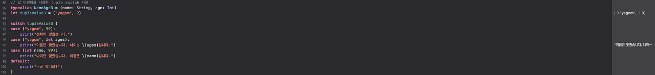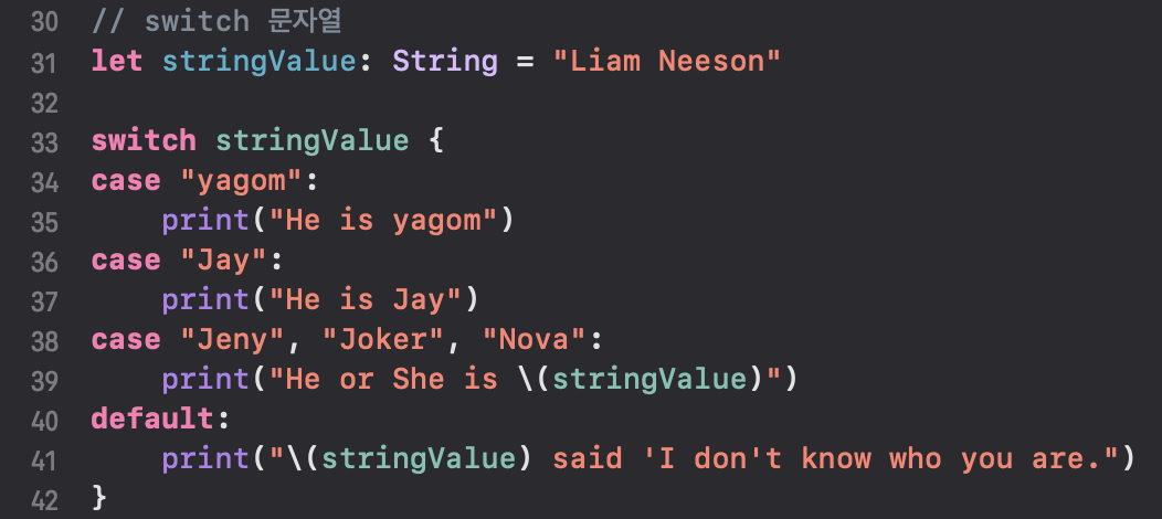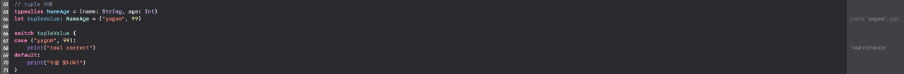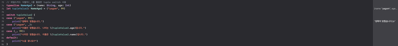 switch는 정수형 뿐만 아니라, Double, Char, String, 튜플 등 다양한 타입 사용 가능.