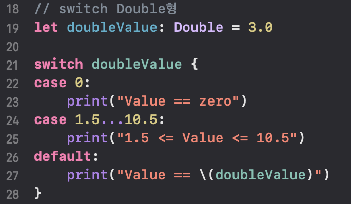 switch는 정수형 뿐만 아니라, Double, Char, String, 튜플 등 다양한 타입 사용 가능.