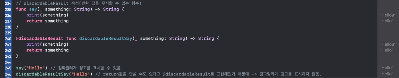 @discardableResult : return값을 안쓸 수도 있다고 @discardableResult로 표현해줬기 때문에, 컴파일러가 경고를 표시하지 않음.