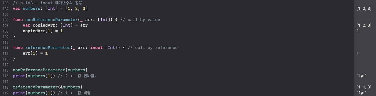 : inout파라미터를 사용하면 (함수로 전달되는 값을 복사하는게 아닌) 파라미터 자체를 전달함.(= 파라미터의 메모리 주소를 전달한다.)
