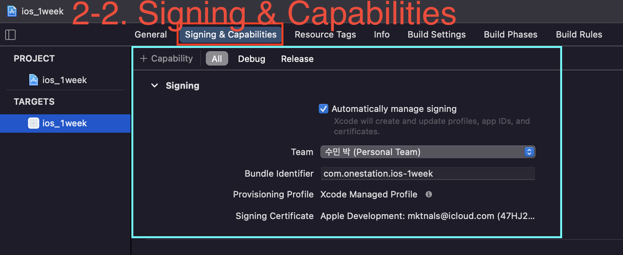 : Automatically manage signing을 체크 → 내 인증과 관련된 자료를 Xcode가 알아서 서버에서 가져온다.