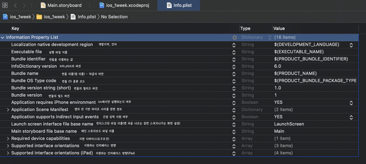 -> 실행 패키지에 관한 필수 설정 정보가 포함되어 있다. 시스템은 이 키와 값을 사용해 앱과 앱의 설정을 가져온다.모든 앱은 info.plist파일을 갖고 있다. 데이터를 구분하기 위한 키(Key)와, 실제적인 데이터가 들어가는 값(Value)으로 구분되어 있다.