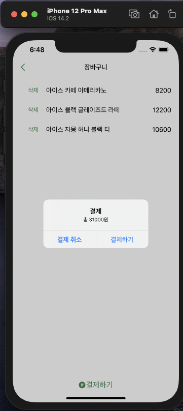 → 주문하기 버튼 클릭 시, 결제 alert.