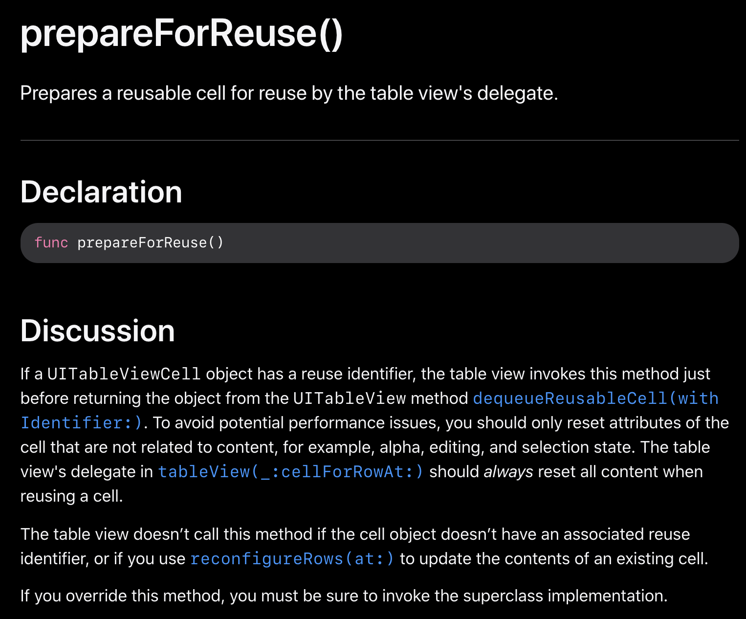 https://developer.apple.com/documentation/uikit/uitableviewcell/1623223-prepareforreuse