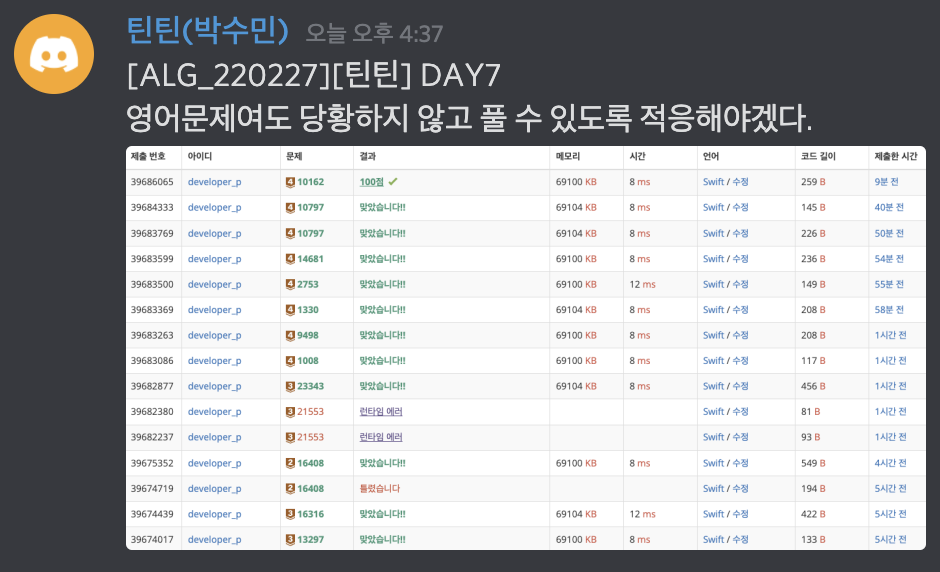 오늘은 참여한지 7일차 입니다.