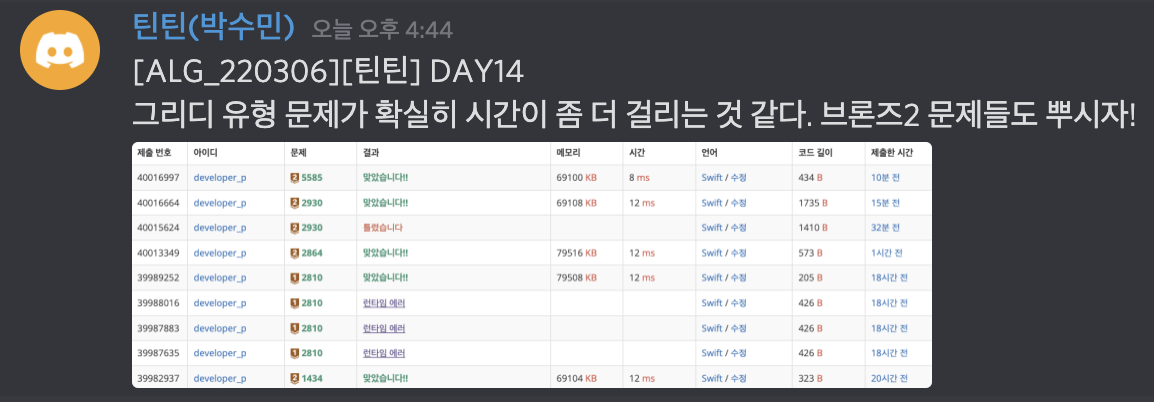 220306 공부 일지 : 그리디 유형 문제가 확실히 시간이 좀 더 걸리는 것 같다. 브론즈2 문제들도 뿌시자!