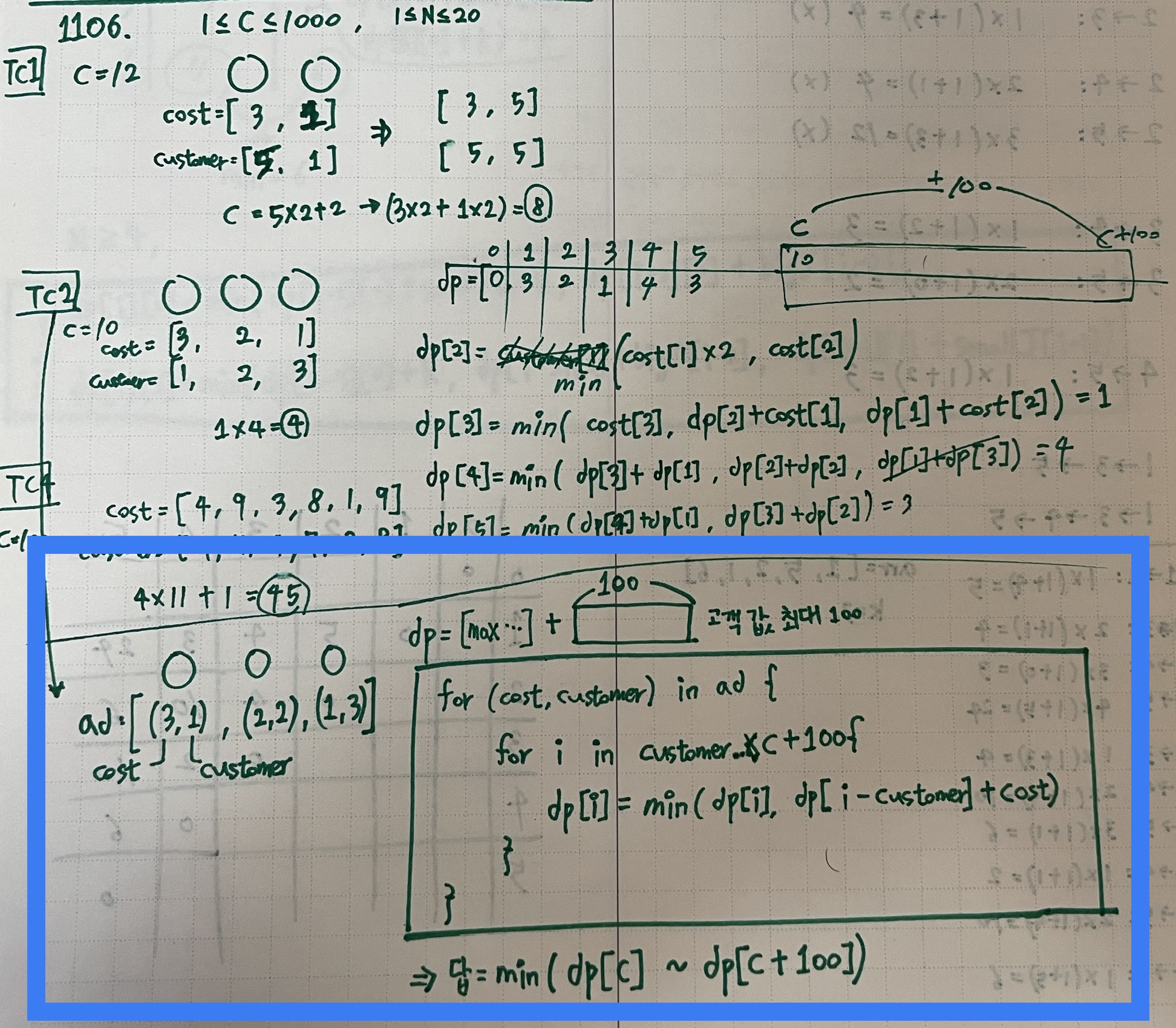 이해가 되는가? 따라서 dp[C] ~ dp[C+100] 중에서 최소값이다.