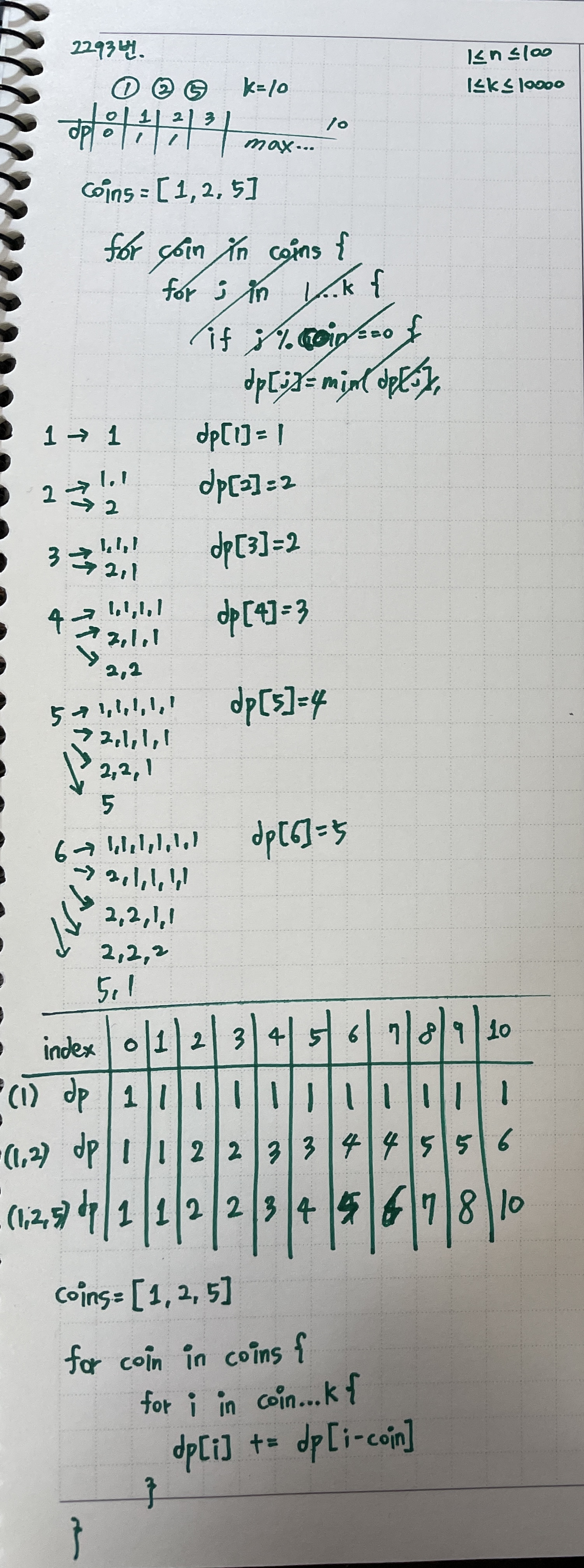 만약 막혀서 글을 찾아오게 된 거라면, dp배열을 0부터 ~ k까지 만들고, dp[0] = 0, 나머지 인덱스엔 10001을 넣고 다시 시도해보길 추천한다.