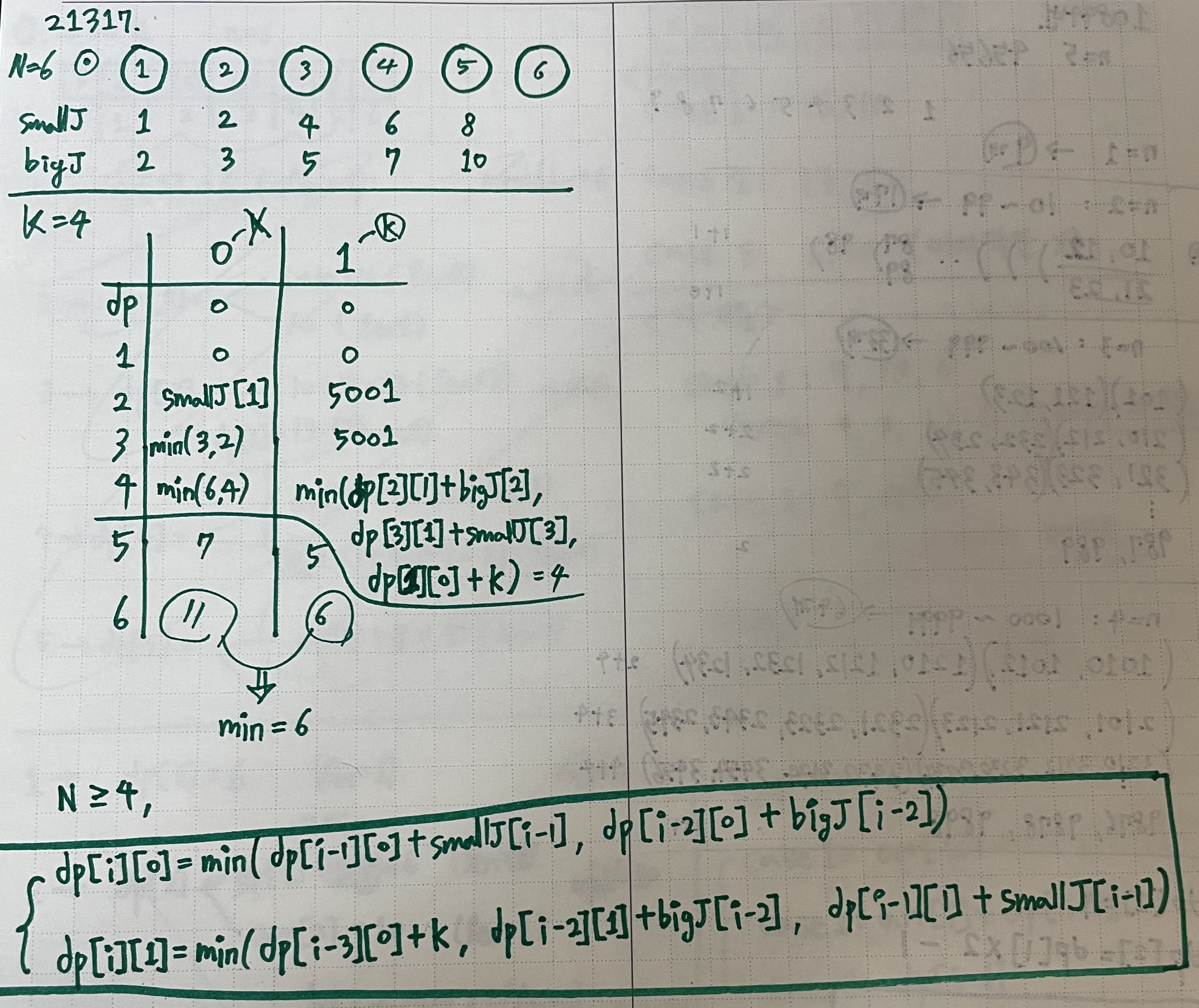 var minTemp = min((dp[i - 1] + smallJ[i - 1]), (dp[i - 2] + bigJ[i - 2])) // 잠시 저장.(k를 쓸 때가 가장 작은지 확인하기 위해.)