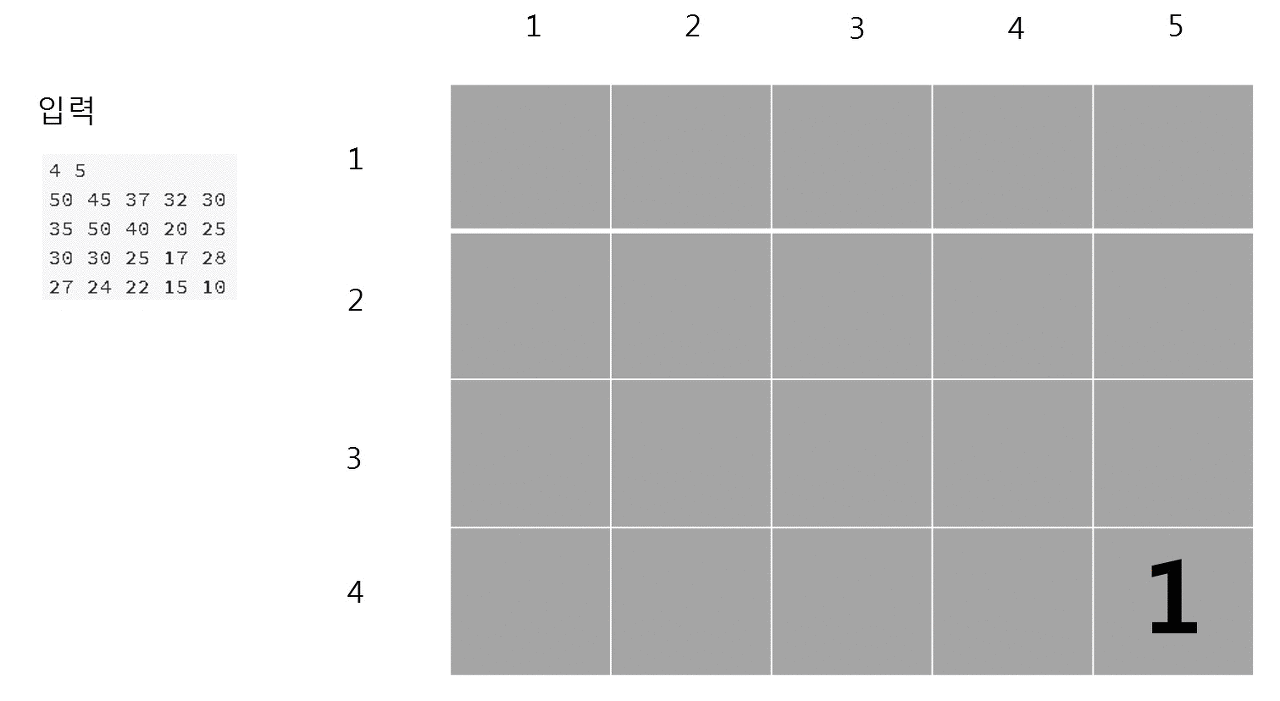 dp[i][j] = max(dp[i - 1][j], dp[i][j - 1]) // 이전 행의 같은 열, 같은 행의 이전 열 중 큰 값을 저장.
