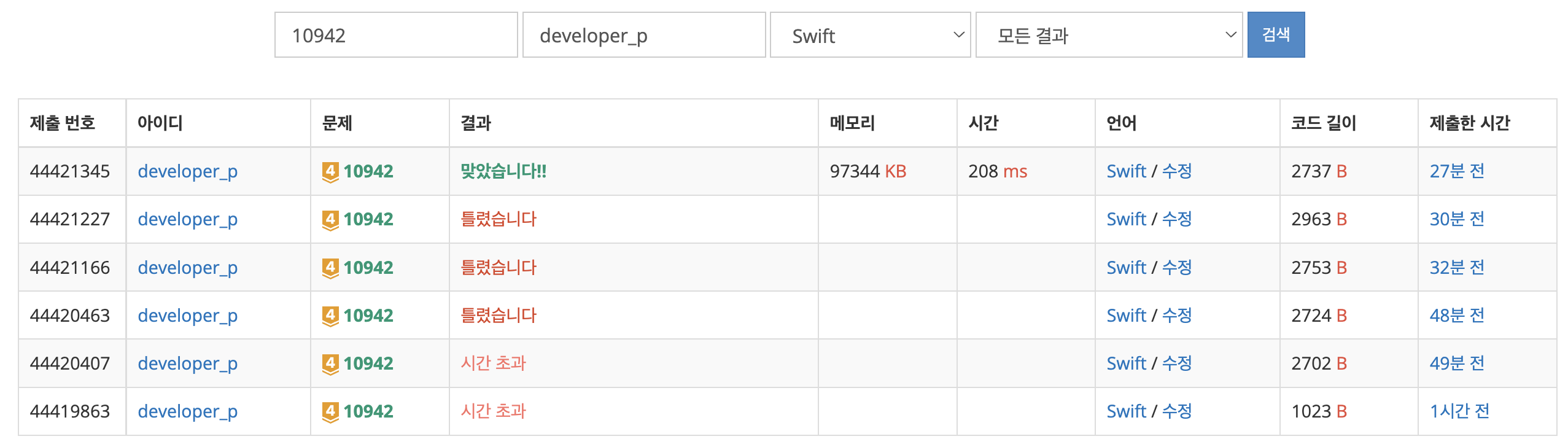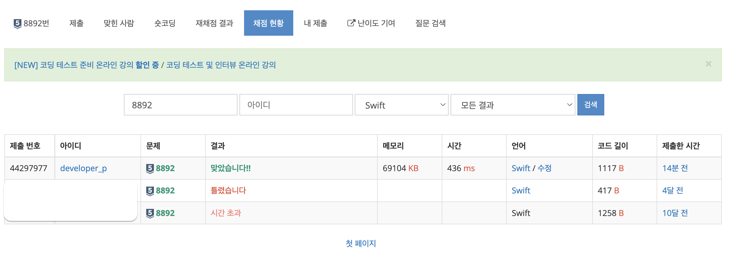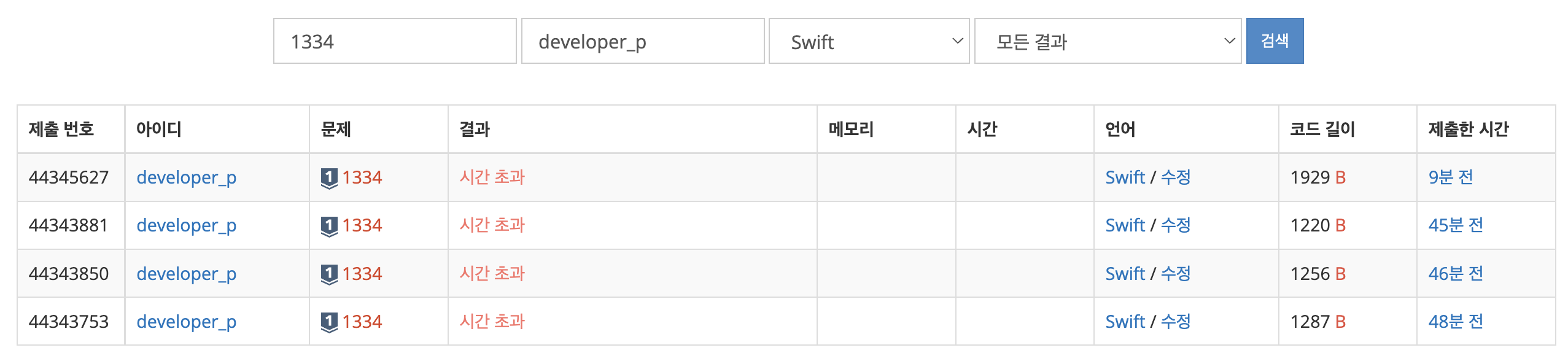 풀이는 맞는데 시간초과가 난다...! Swift로 맞은 사람이 없는 걸 보니까