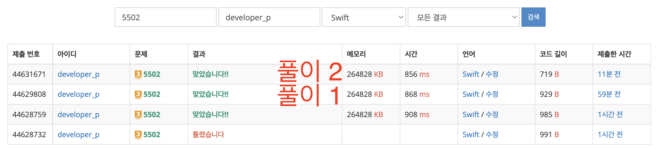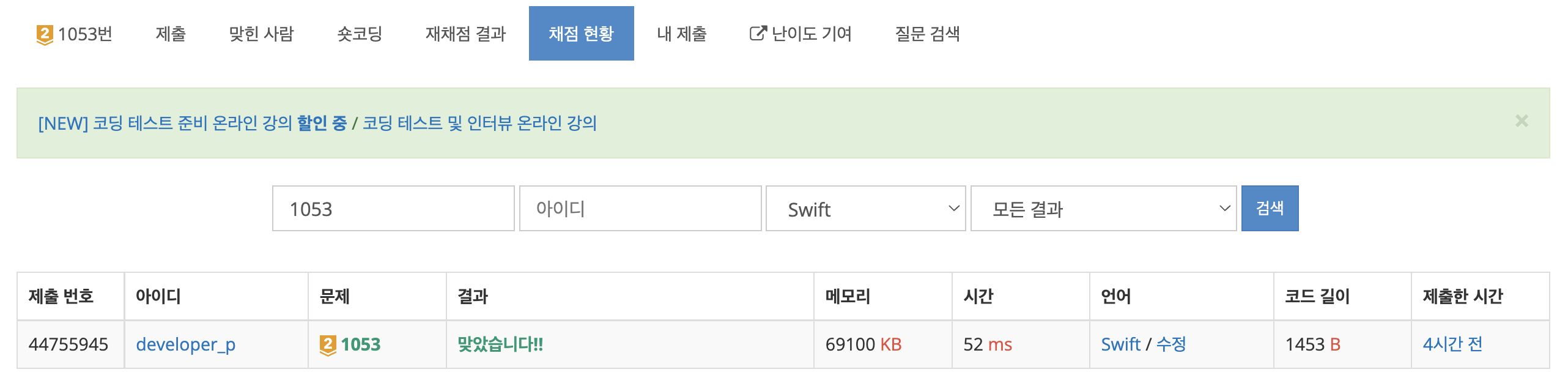 공부하면서 Swift 기준 최초 풀이에 등극할 때 마다 기분이 참 좋다. ㅎㅎ