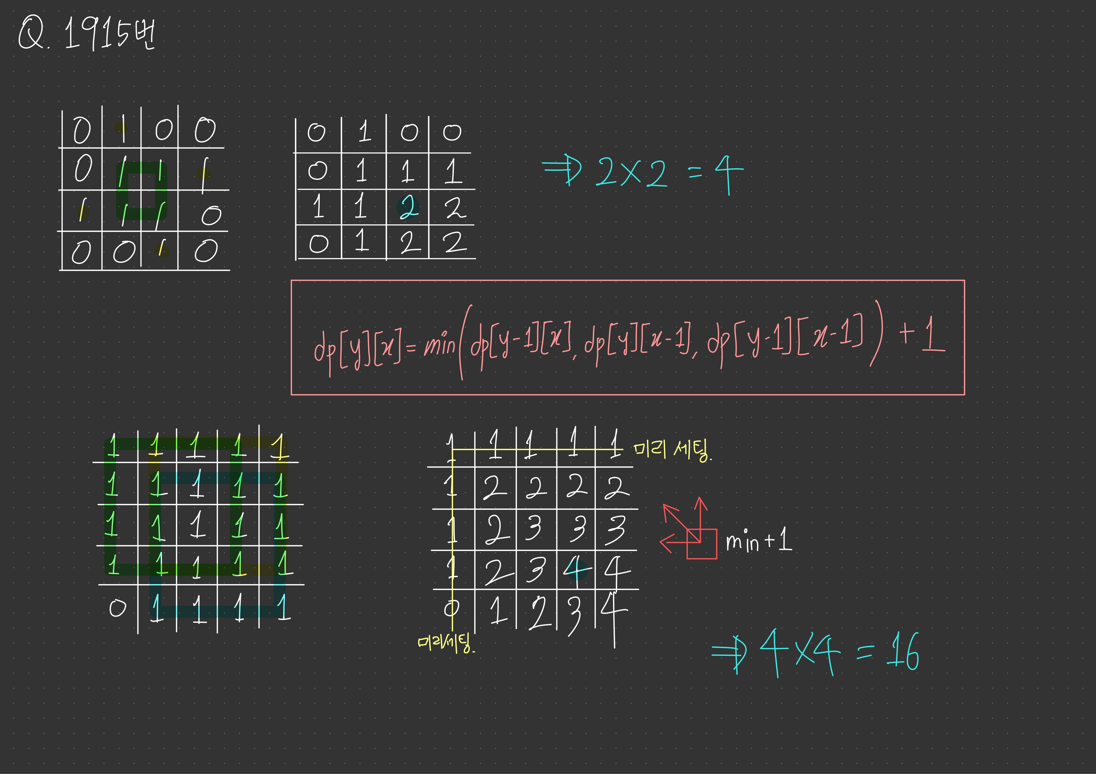 dp[y][x] = min(dp[y - 1][x], dp[y][x - 1], dp[y - 1][x - 1]) + 1 // min(↑, ←, ↖) + 1