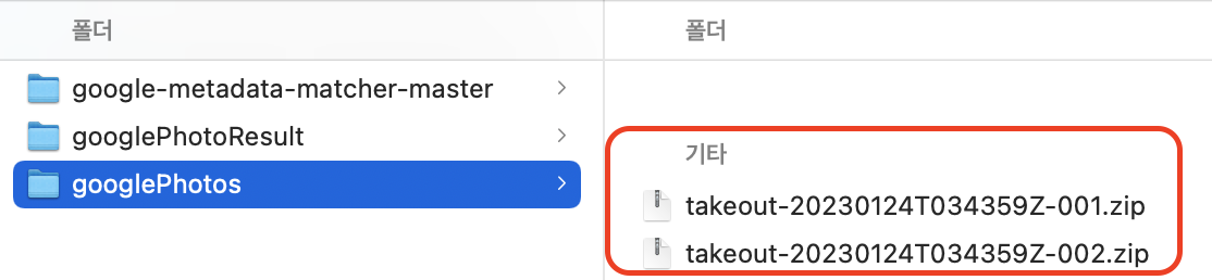 3-2. 데스크탑 - googlePhotos 폴더에 아래 사진과 같이 압축파일들을 옮긴다.