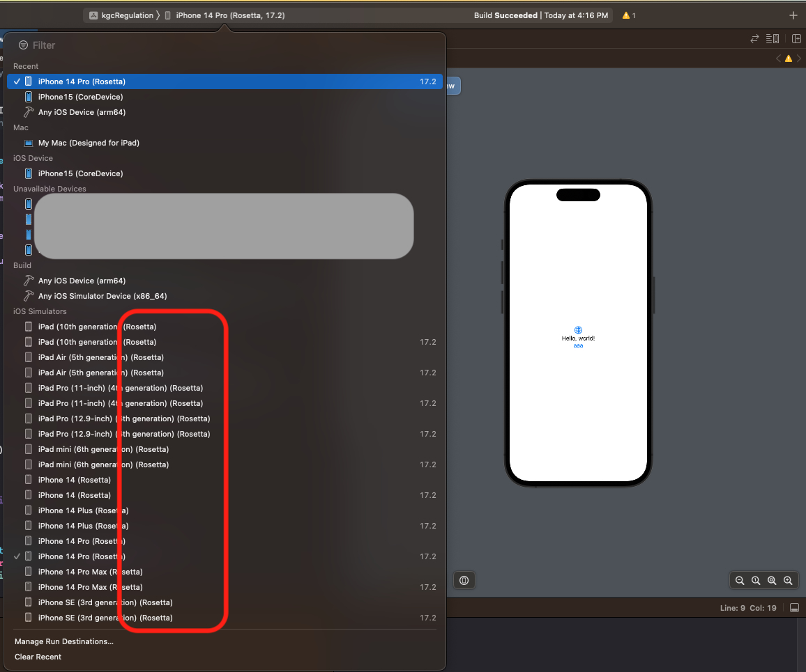 이렇게 설정하고 나면, 시뮬레이터 이름들이 (Rosetta) 가 붙으면서 정상적으로 빌드가 될 것이다. (아래 사진 참고)