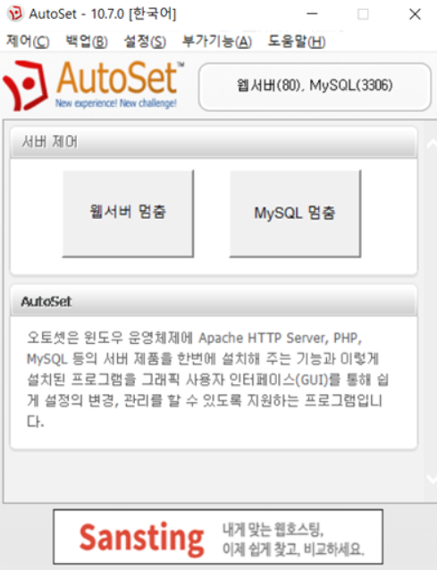 (기본 포트 충돌로 인해 동시에 사용 할 수 없습니다. 동시에 사용해야 하는 경우라면 오토셋 설치 후, 웹 서버와 MySQL 포트를 변경 후 오토셋을 사용하시면 됩니다.)