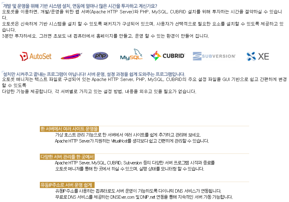 AutoSet은 쉽고 빠르게 웹 개발 환경, 운영 환경을 구축하기 위해 만들어진 프로그램입니다.