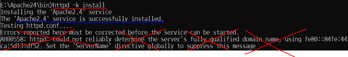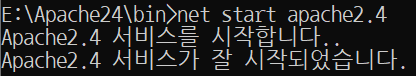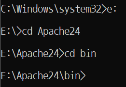 e: 드라이브로 간 뒤 → Apache24 폴더로 가고 → bin 폴더로 간 뒤 → dir 입력.