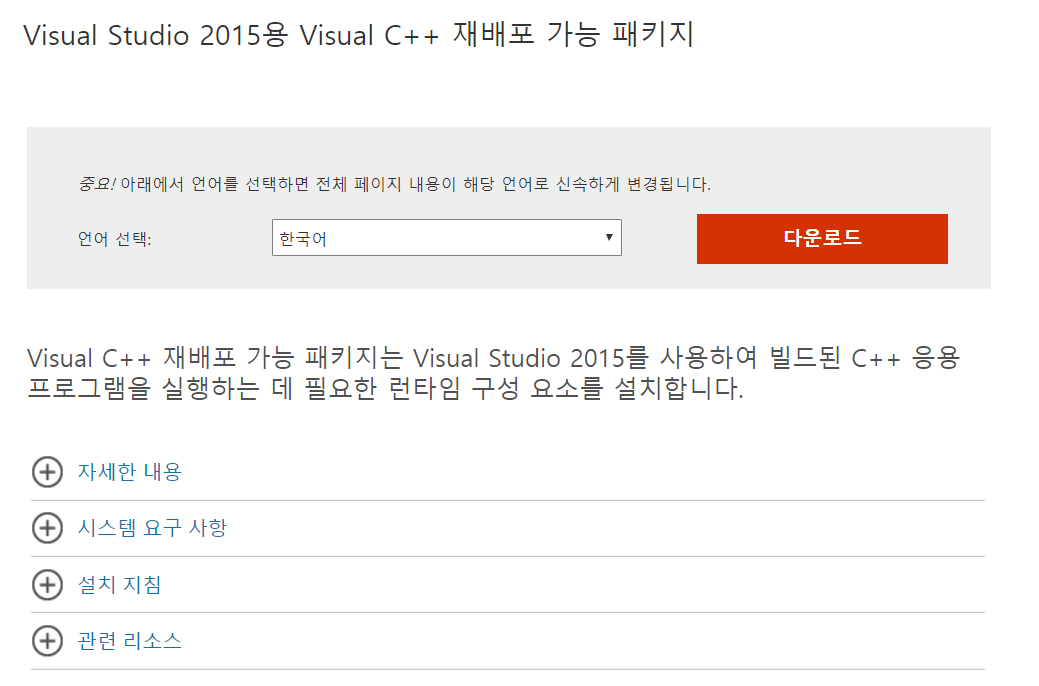 Visual Studio 2015용 Visual C++ 재배포 가능 패키지