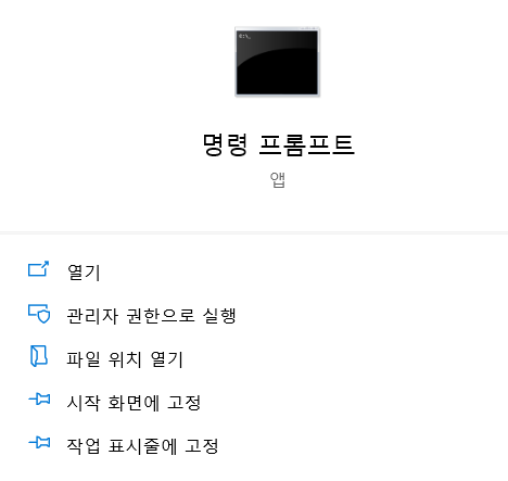 왼쪽 밑 검색창에 cmd 입력 후, 우클릭을 통해 관리자 권한으로 실행하면 됩니다.