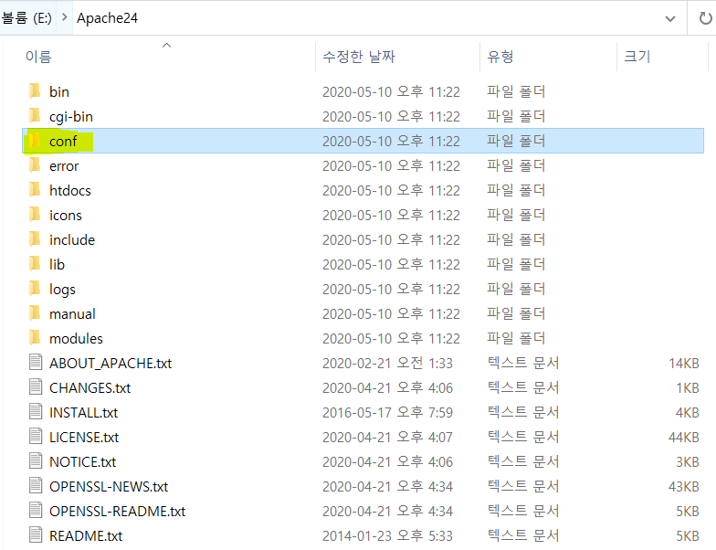 Apache24폴더 내에 있는 conf 폴더를 들어갑니다.