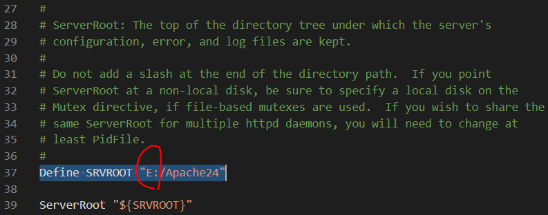 37째줄. 서버 루트 디렉토리가 기본적으론 "c:/Apache24"로 설정되어 있습니다.
