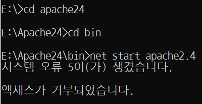 cmd창에서 apache24를 실행시키려는데, 갑자기 발생하지 않던 시스템 오류 5가 발생합니다.