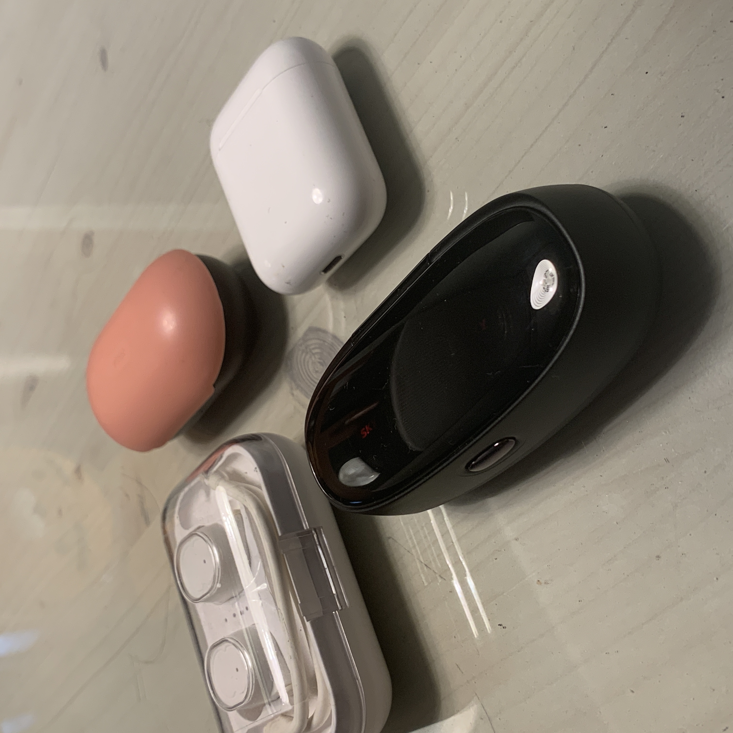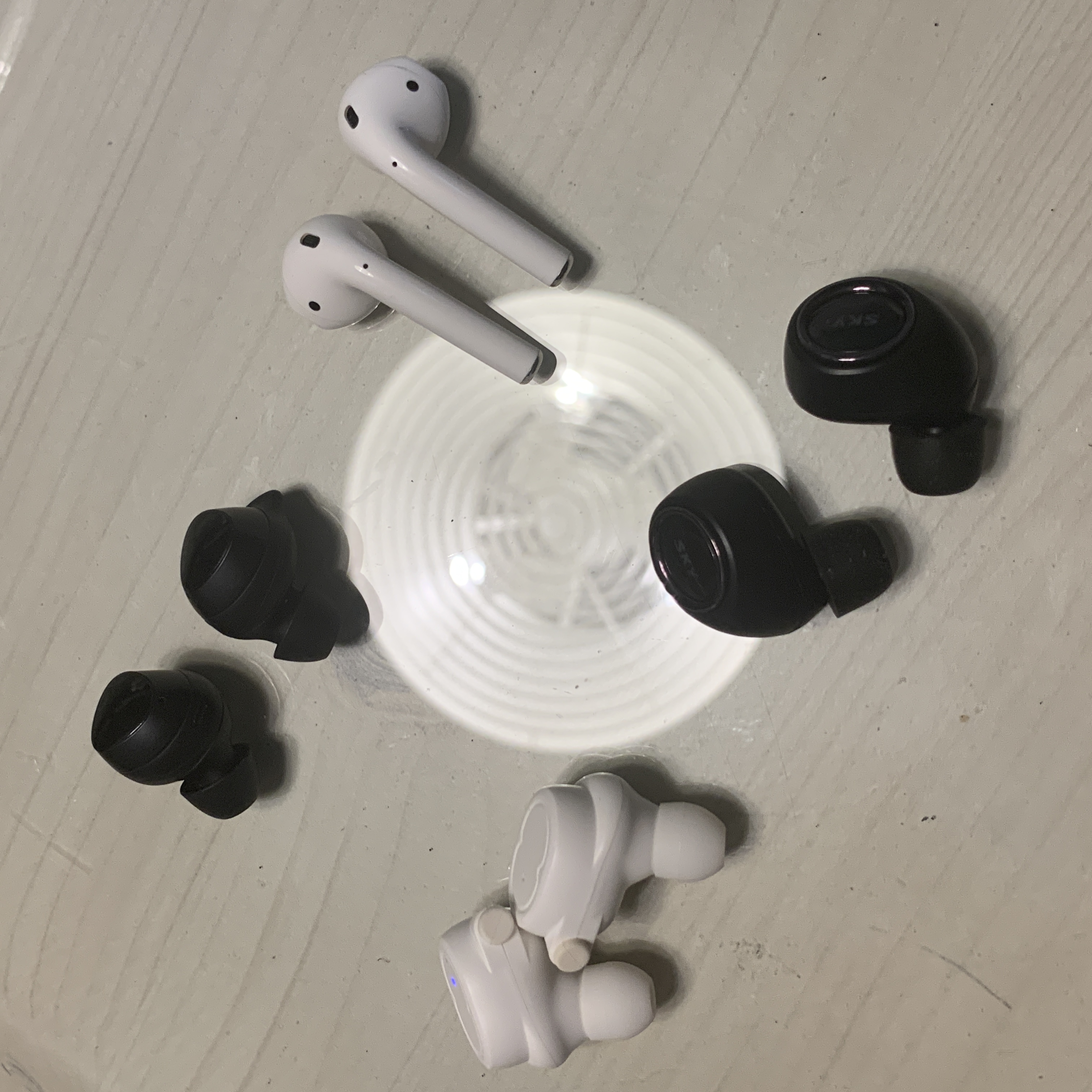 왼쪽 상단부터 갤럭시 버즈, 에어팟 1세대, TWS-01, 스카이 핏 프로 블랙 입니다.