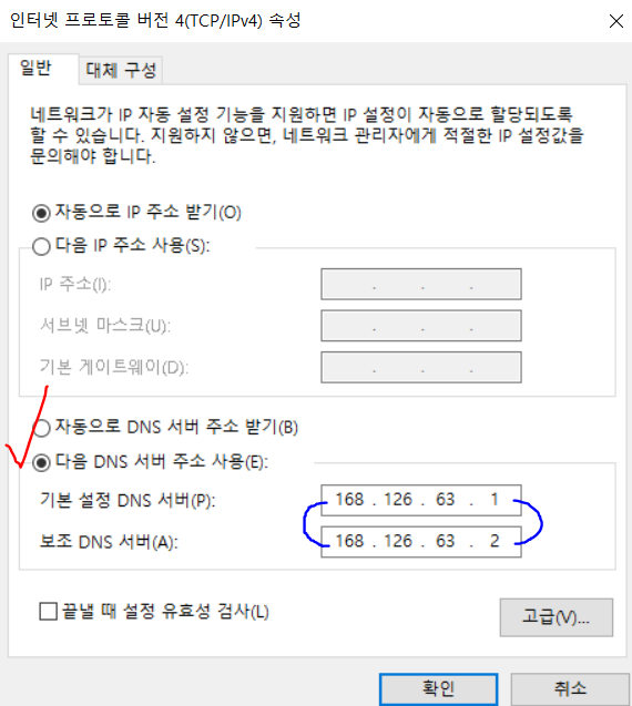 기본 설정 DNS 서버(P)에 168.126.63.1을 입력합니다.