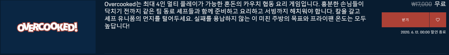 현재 에픽게임즈에서 오버쿡을 무료로 배포중에 있습니다!