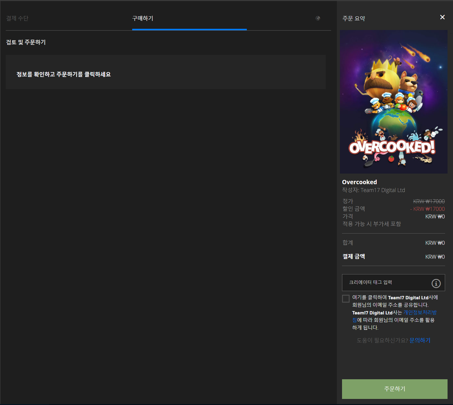 위 이미지와 같이 오버쿡이 -\0 으로 돼있다면, 무료로 구매 성공!