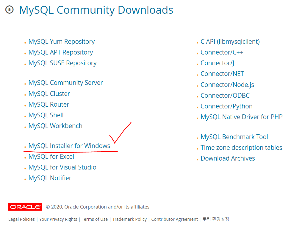 3. mysql-installer-web-community-8.0.20.0 msi 파일을 받습니다.