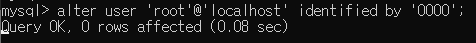 alter user 'root'@'localhost' identified by '0000'; 를 입력합니다.