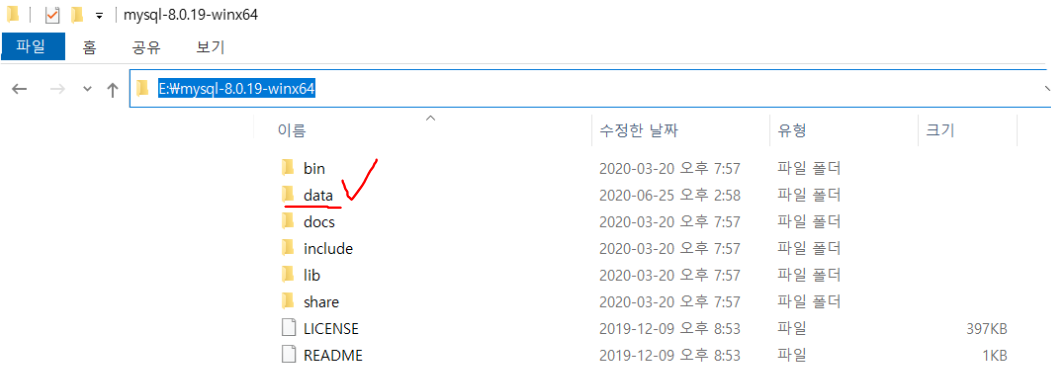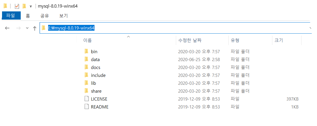 파란색으로 표시된 폴더 경로를 복사합니다. (즉, E:\mysql-8.0.19-winx64 를 복사합니다.)