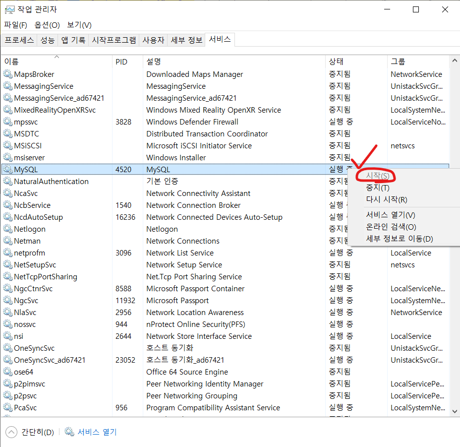 서비스 탭 클릭 후, MySQL을 우클릭 후 시작을 클릭합니다.