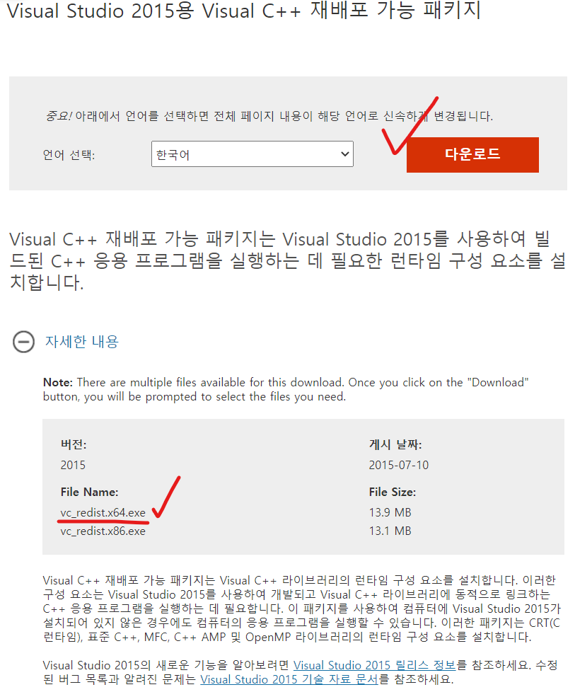 Visual Studio 2015용 Visual C++ 재배포 가능 패키지