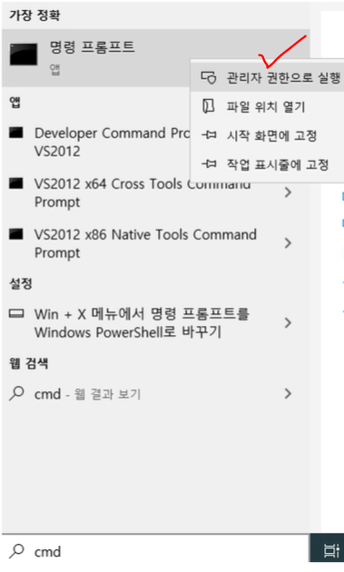 윈도우 키 → cmd(명령 프롬프트)검색 → 우클릭 → 관리자 권한으로 실행 클릭.