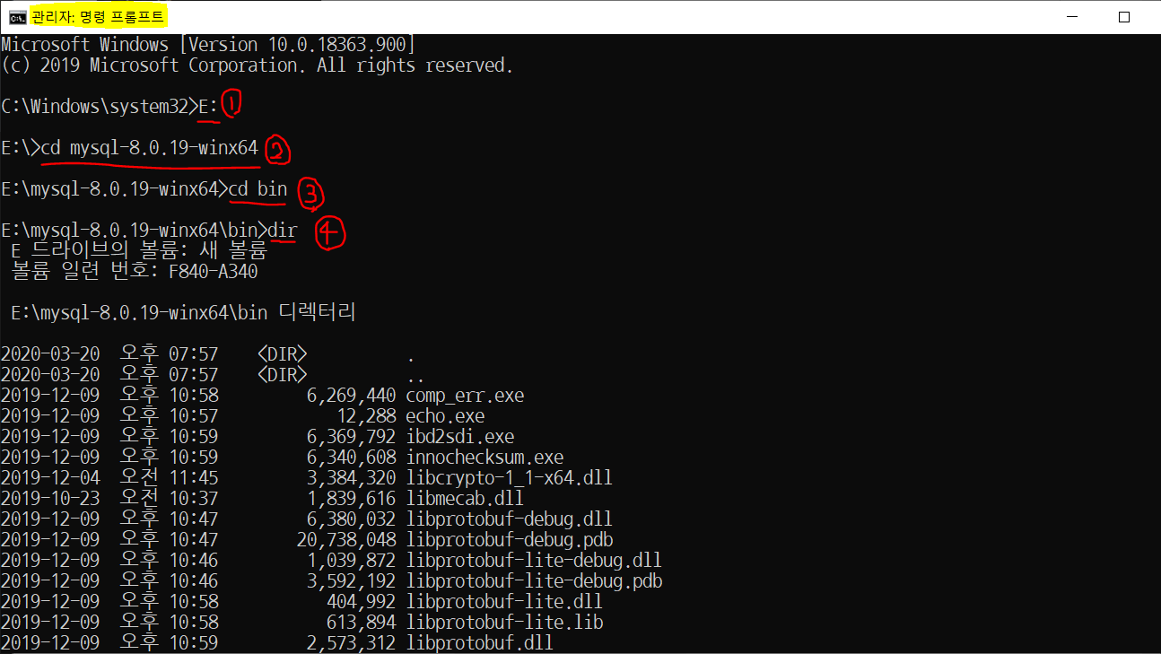 파란색으로 표시된 폴더 경로를 복사합니다. (즉, E:\mysql-8.0.19-winx64 를 복사합니다.)