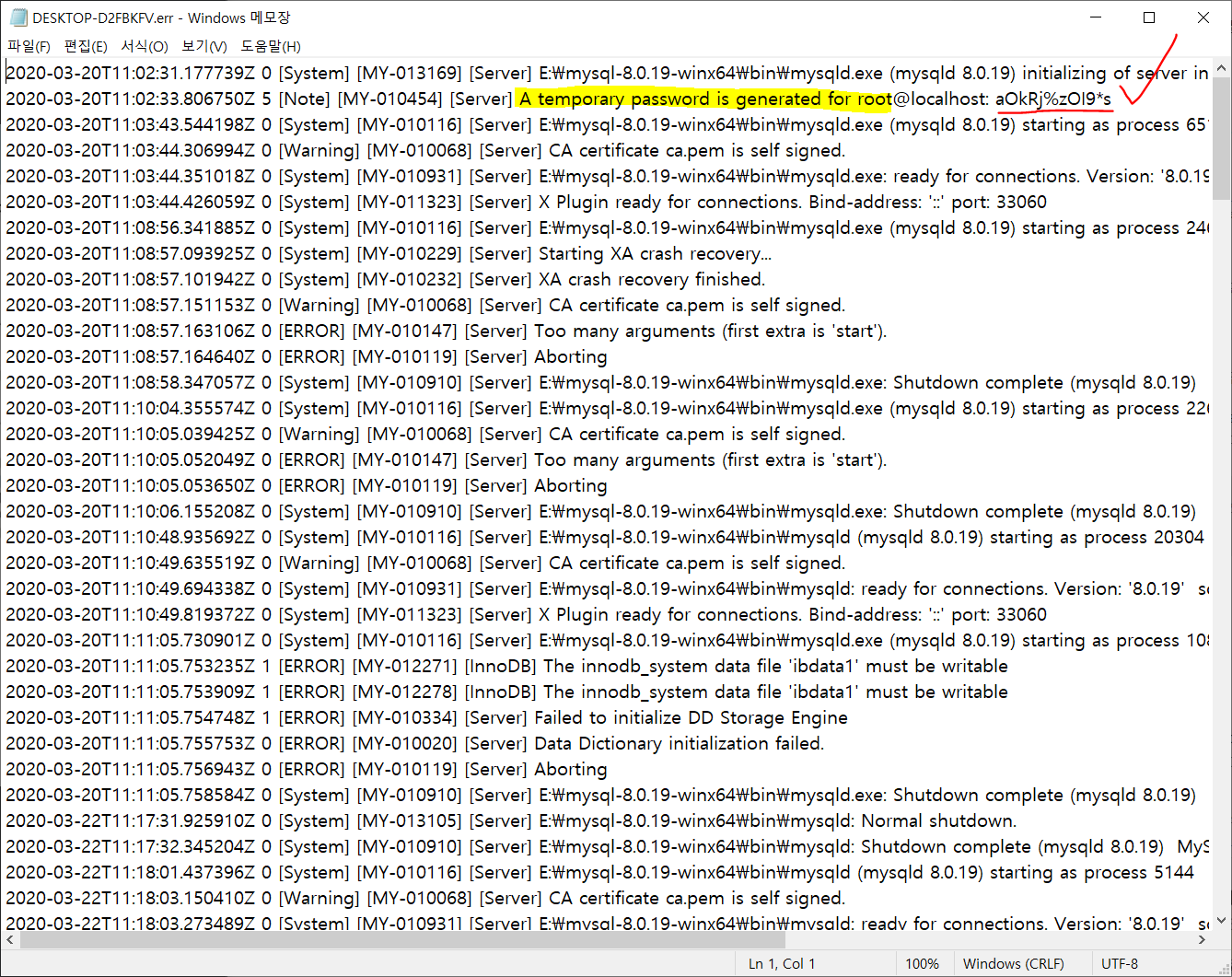 7-1. mysqld --initialize 를 입력 후 다음과 같은 오류가 발생할 수 있습니다.